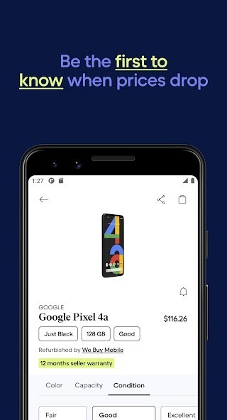 Back Market is the best marketplace to snag premium quality refurbished tech like smartphones, laptops, game consoles, and tablets at up to 70% less than brand new. Better for your wallet, better for the planet.With our app you can:🛒 Shop for refurbished tech (premium quality used electronics)📦 Keep tabs on all your orders⭐ Save your fave devices🔔 Track price drops💰 Assess your tech for trade-inBuy online refurbished devices from certified refurbishers ✅ Every device comes with a free 1-year warranty.